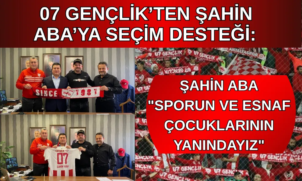 Antalyaspor taraftar grubu 07 Gençlik, 18 Ocak’ta yapılacak Antalya Bakkallar Odası seçimleri öncesinde Şahin Aba’ya desteklerini açıklayarak, spora verdiği katkılar için teşekkür etti.