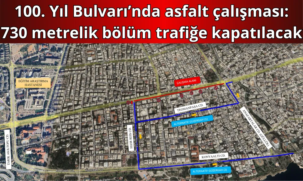 Büyükşehir Belediyesi Fen İşleri Dairesi Başkanlığı tarafından yürütülen çalışma kapsamında, 100. Yıl Bulvarı’nın Konyaaltı istikametinden şehir merkezi yönüne gidiş bölümünde, Hızır Reis Caddesi ile Anafartalar Caddesi (Güllük Kavşağı) arasında kalan yaklaşık 730 metrelik bölümde sıcak asfalt çalışması gerçekleştirilecek.