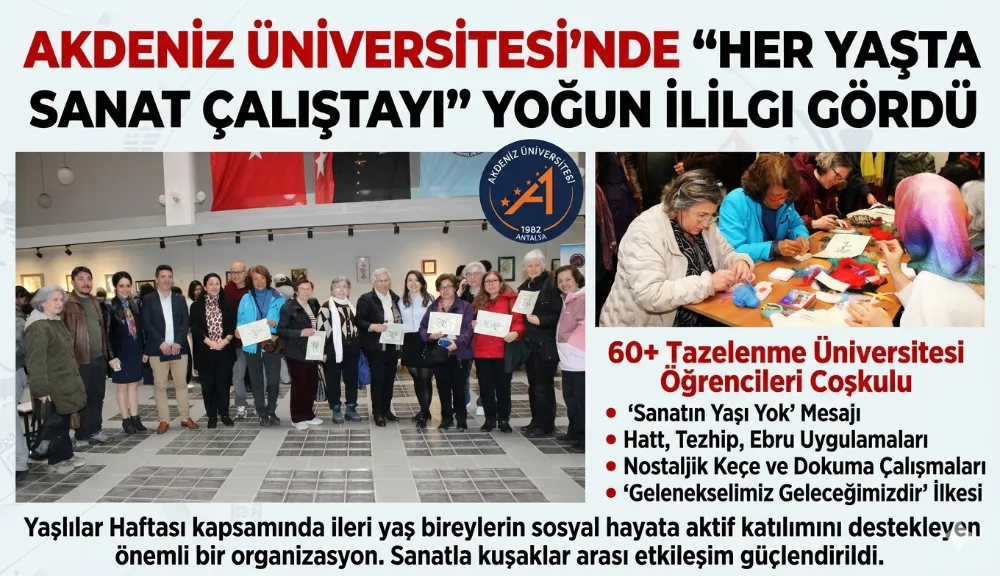 Akdeniz Üniversitesi Güzel Sanatlar Fakültesi ev sahipliğinde düzenlenen “Her Yaşta Sanat Çalıştayı”, 60+ Tazelenme Üniversitesi öğrencilerinin katılımıyla coşkulu bir atmosferde gerçekleştirildi. Yaşlılar Haftası kapsamında hayata geçirilen etkinlik, ileri yaş bireylerin sosyal hayata aktif katılımını destekleyen önemli bir organizasyon olarak öne çıktı.