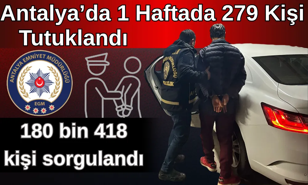 Antalya genelinde Emniyet Müdürlüğü birimlerince son 1 haftada gerçekleştirilen asayiş uygulamaları ve denetimlerde, aralarında kasten yaralama, yağma, cinsel suçlar ve hırsızlık suçlarının da bulunduğu çok sayıda olaya müdahale edildi. Çalışmalar kapsamında 279 kişi tutuklandı.