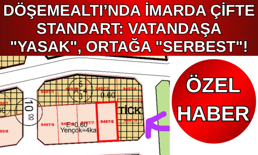 Döşemealtı Devlet Hastanesi acil servisi karşısındaki parsellerde uygulanan imar oyunları, belediyenin kendi yazılı beyanlarıyla çelişiyor. Diğer mülk sahiplerinin "ticari alan" taleplerini "10 metrelik yol yaya yoludur, ticari yapılamaz" diyerek reddeden belediyenin, aynı şartlardaki bir parsele imtiyaz tanıması infial yarattı.