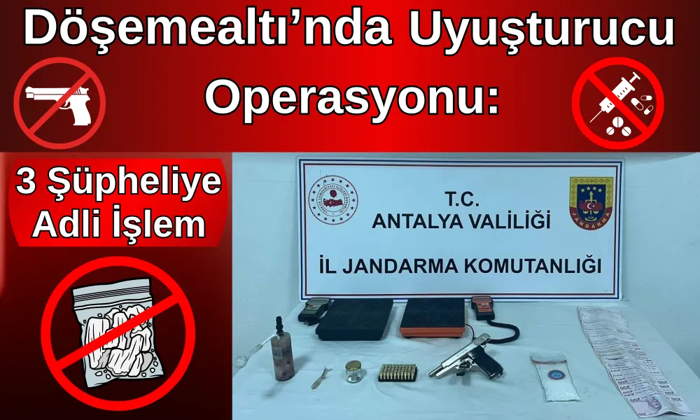 Antalya İl Jandarma Komutanlığı ekiplerince yürütülen çalışmalar kapsamında, Antalya Cumhuriyet Başsavcılığı’nın talimatları doğrultusunda Döşemealtı ilçesinde uyuşturucuyla mücadeleye yönelik operasyon gerçekleştirildi.