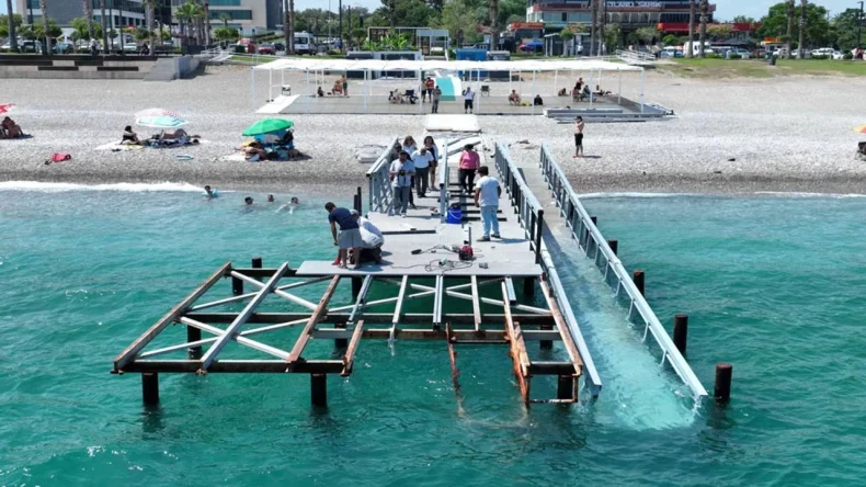 Antalya’da yaşayan ya da şehir dışından tatil için kente gelen engelli vatandaşların rahatlıkla denize girebildiği, geçtiğimiz yıl da 44 bin kişiye hizmet veren Konyaaltı Sahili’ndeki Büyükşehir Belediyesi Engelsiz Plaj yeniden düzenlenip bakım ve onarımı yapılarak engelli vatandaşların kullanabileceği hale getiriliyor. Büyükşehir Belediyesi Fen İşleri Dairesi Başkanlığı ekipleri, iskele ve donatıları yeniliyor. Plajın iskelesi dalga ve fırtınalardan etkilenmemesi için ahşap malzeme yerine daha sağlam ve kaliteli bir malzemeyle yenileniyor. Plaja ait cankurtaran kulesi de iskele üzerine monte ediliyor. Ayrıca bu yıl engelli bireylerin denize ulaşımını sağlayacak yatay asansör sistemi de yenileniyor.