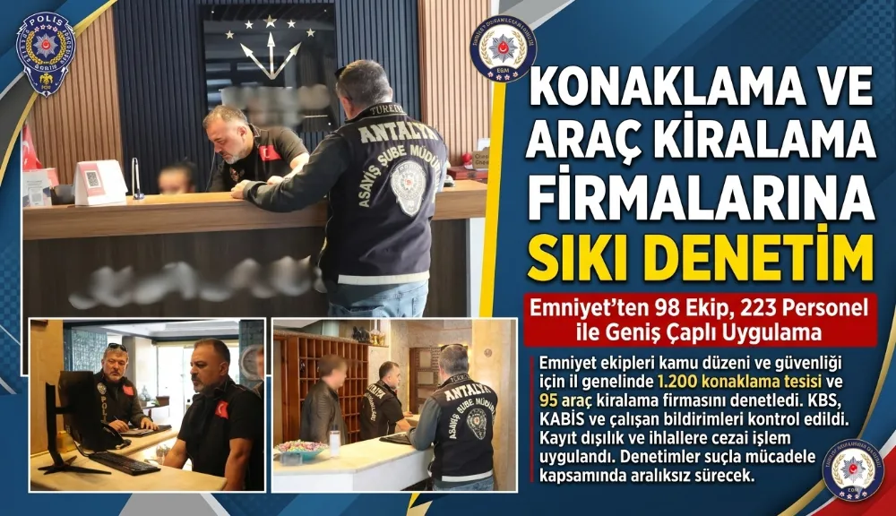 İl genelinde konaklama tesisleri ve araç kiralama firmalarına yönelik geniş çaplı denetim gerçekleştirildi. Emniyet birimleri tarafından son iki haftada yapılan eş zamanlı uygulamalarda, kamu düzeni ve güvenliğin sağlanması hedeflendi.
