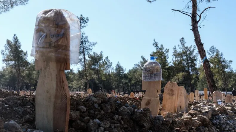 Kahramanmaraş Kapıçam Mezarlığı’nda yakınlarını kaybeden aileler mezar yerlerini bulmak için iz bırakıyor. Bazı aileler ağaçları işaretlerken bazıları ise bir eşyasını bırakıyor. Kabir tahtaları yazıları silinmesin diye naylon ile kaplanıyor.