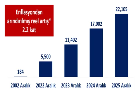 Ekonomik program döneminde asgari ücrette enflasyonun üzerinde artışlar yapılırken, 2002–2025 arasında ücretin reel olarak 2,2 kat arttığı görülüyor. 2023 ve 2024’te enflasyonun üzerinde yapılan zamların ardından 2025 asgari ücreti yüzde 30 artışla 22 bin 104 liraya yükseltildi.