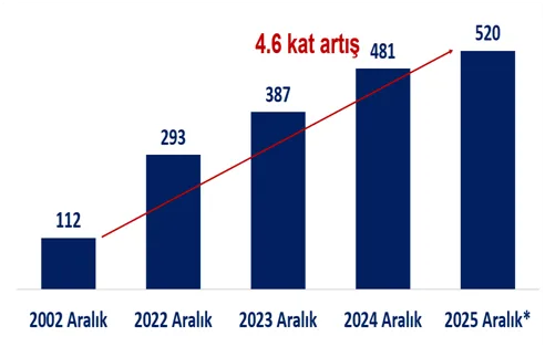 Asgari ücretin dolar bazındaki seyri de dikkat çekici. 2022’de 112 dolar seviyesinde olan ücret, 2025 Aralık kuru üzerinden hesaplandığında 520 dolara ulaşarak 4,6 kat artış göstermiş durumda.