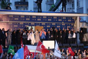 14 Mayıs seçimleri öncesi AK Parti Mersin İl Başkanlığınca Millet Bahçesi yanındaki alanda düzenlenen mitinge katılan Cumhurbaşkanı Erdoğan, eşi Emine Erdoğan ile birlikte kalabalığı selamladı. Miting alanında seslendirilen Cengiz Kurtoğlu'nun 'Duyanlara duymayanlara' şarkısına eşlik eden Cumhurbaşkanı Erdoğan, "14 Mayıs'ta inşallah bu sevdamızı tavan yaptıracağız" ifadelerini kullanarak, meydanda toplanan kalabalığa, "Hazır mıyız buna? 14 Mayıs'ta sandıkları patlatıyor muyuz?" diye sordu.